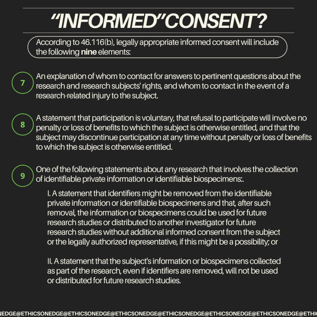 Realizing the effectiveness of leveraging legal language as an attack vector against those engaging in human research for nefarious purposes (gain-of-function, gene editing, cloning, etc.), which begs for a collaborative rethinking of the informed consent construct on how it can be improved for individual and thereby collective empowerment.